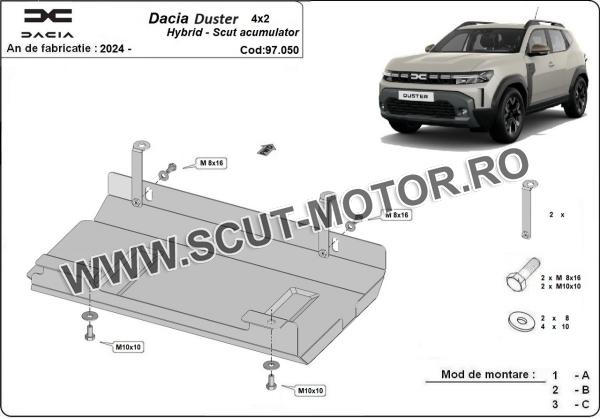 Scutul este noua si se potriveste perfect pentru tipurile de motorizare Hybrid - Dacia Duster fabricat între ani 2024 - 2025. Scutul protejeazã: acumulator.