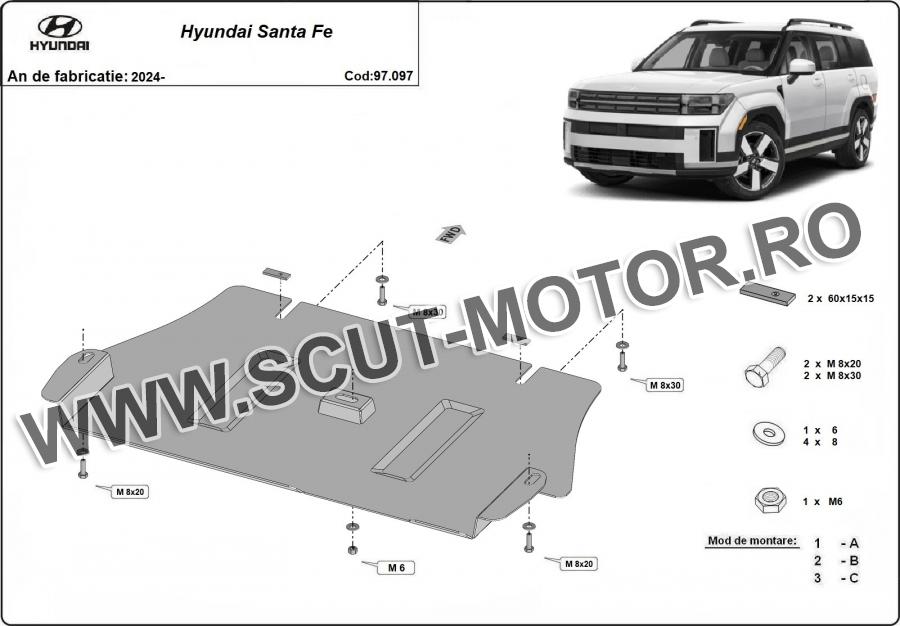 Scutul este noua si se potriveste perfect pentru toate tipurile de motorizare Hyundai Santa Fe fabricat între ani 2024 - 2026. Scutul protejeazã: Catalizator.