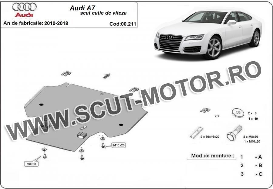 Scutul este noua si se potriveste perfect pentru toate tipurile de motorizare Audi A7 fabricat între ani 2011 - 2018. Scutul protejeazã: cutie de viteză.