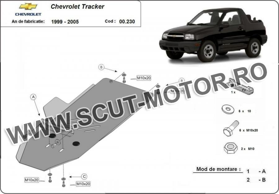 Scutul este noua si se potriveste perfect pentru toate tipurile de motorizare Chevrolet Tracker fabricat între ani 1999 - 2005. Scutul protejeazã: cutie de viteză.