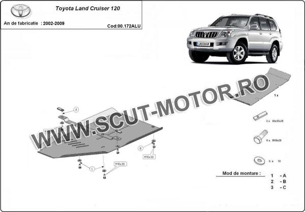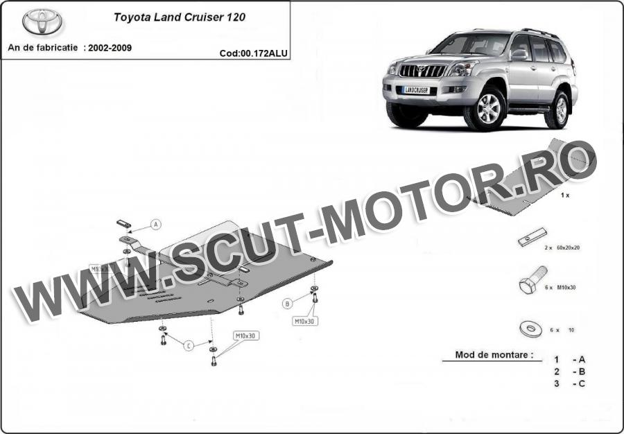 Scutul este noua si se potriveste perfect pentru tipurile de motorizare 3.0,4.2 D - Toyota Land Cruiser J120 fabricat între ani 2002 - 2009. Scutul protejeazã: cutie de viteză.