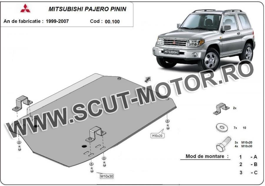 Scutul este noua si se potriveste perfect pentru toate tipurile de motorizare Mitsubishi Pajero Pinin fabricat între ani 1997 - 2007. Scutul protejeazã: cutie de viteză.
