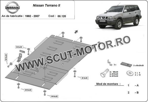 Scutul este noua si se potriveste perfect pentru toate tipurile de motorizare Nissan Terrano II fabricat între ani 1992 - 2007. Scutul protejeazã: cutie de viteză, reductor.