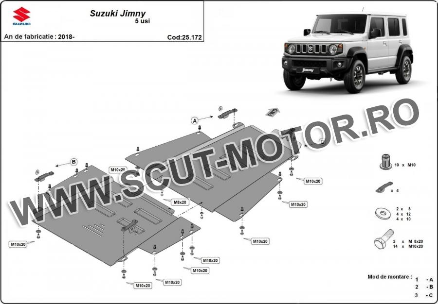 Scutul este noua si se potriveste perfect pentru toate tipurile de motorizare Suzuki Jimny fabricat între ani 2018 - 2025. Scutul protejeazã: cutie de viteză, reductor.