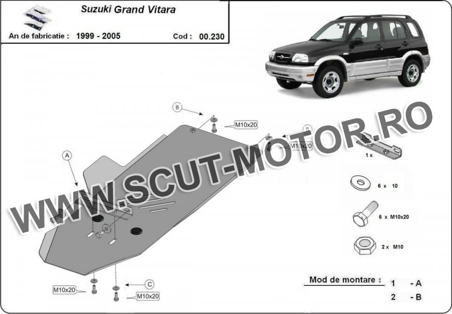 Scutul este noua si se potriveste perfect pentru toate tipurile de motorizare Suzuki Grand Vitara fabricat între ani 1999 - 2005. Scutul protejeazã: cutie de viteză.