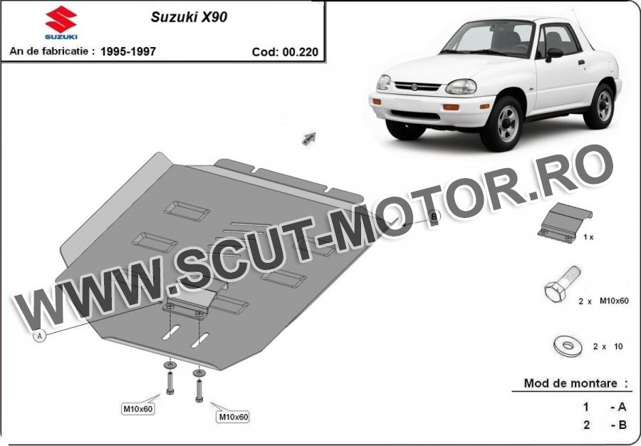 Scutul este noua si se potriveste perfect pentru toate tipurile de motorizare Suzuki X90 fabricat între ani 1995 - 1997. Scutul protejeazã: cutie de viteză.