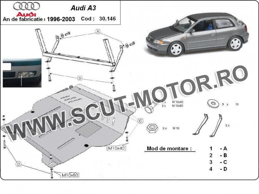 Scutul este noua si se potriveste perfect pentru toate tipurile de motorizare Audi A3 fabricat între ani 1996 - 2003. Scutul protejeazã: motor, cutie de viteză, radiator, bara față.