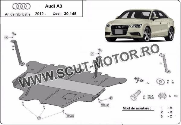 Scutul este noua si se potriveste perfect pentru toate tipurile de motorizare Audi A3 (8V) fabricat între ani 2012 - 2025. Scutul protejeazã: motor, cutie de viteză, radiator, bara față.