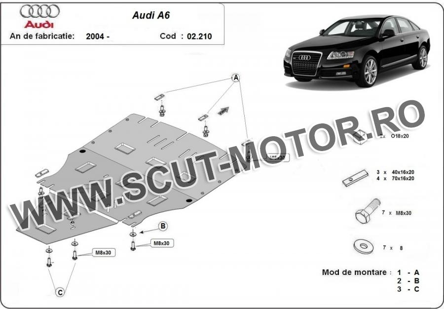 Scutul este noua si se potriveste perfect pentru tipurile de motorizare Fara laterale!!! - Audi A6 fabricat între ani 2004 - 2011. Scutul protejeazã: motor, cutie de viteză, radiator, bara față.