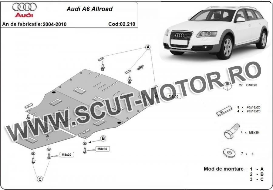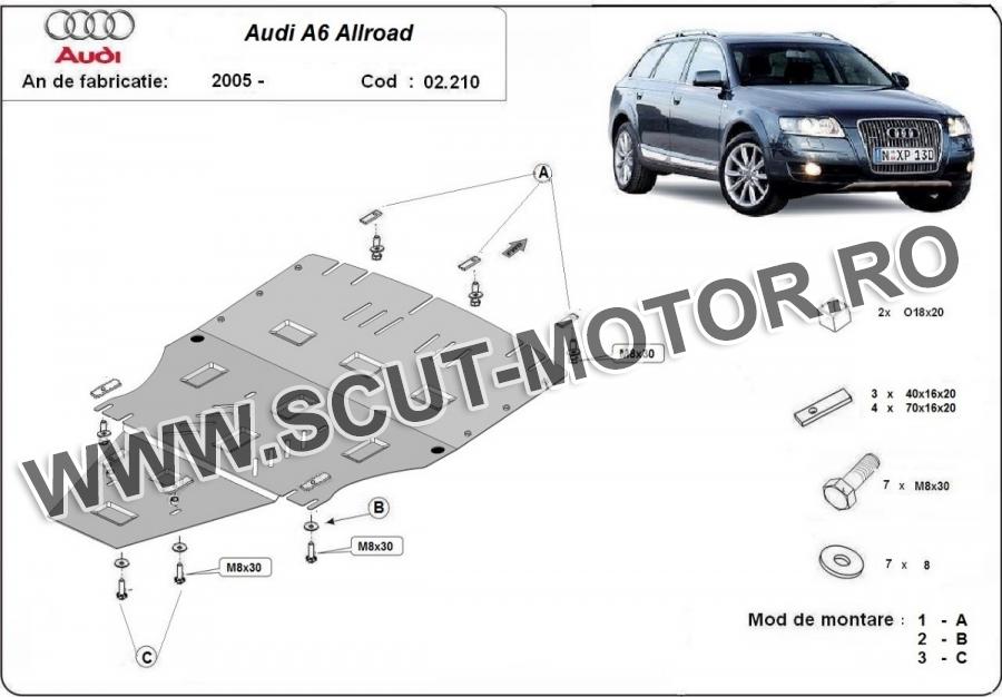 Scutul este noua si se potriveste perfect pentru tipurile de motorizare - Audi A6 Allroad II fabricat între ani 2005 - 2011. Scutul protejeazã: motor, cutie de viteză, radiator, bara față.