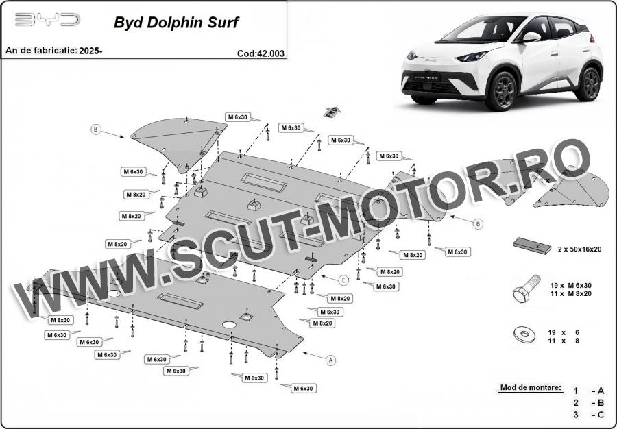 Scutul este noua si se potriveste perfect pentru toate tipurile de motorizare BYD Dolphin Surf fabricat între ani 2025 - 2026. Scutul protejeazã: motor, bara față, cutie de viteză, radiator, grup fata.