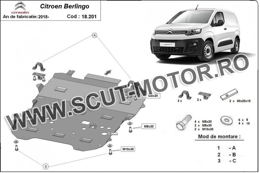 Scutul este noua si se potriveste perfect pentru toate tipurile de motorizare Citroen Berlingo fabricat între ani 2018 - 2026. Scutul protejeazã: motor, cutie de viteză, radiator, bara față.