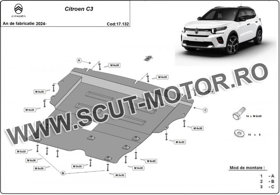 Scutul este noua si se potriveste perfect pentru toate tipurile de motorizare Citroen C3 fabricat între ani 2025 - 2026. Scutul protejeazã: motor, cutie de viteză, jug motor/cadru motor.