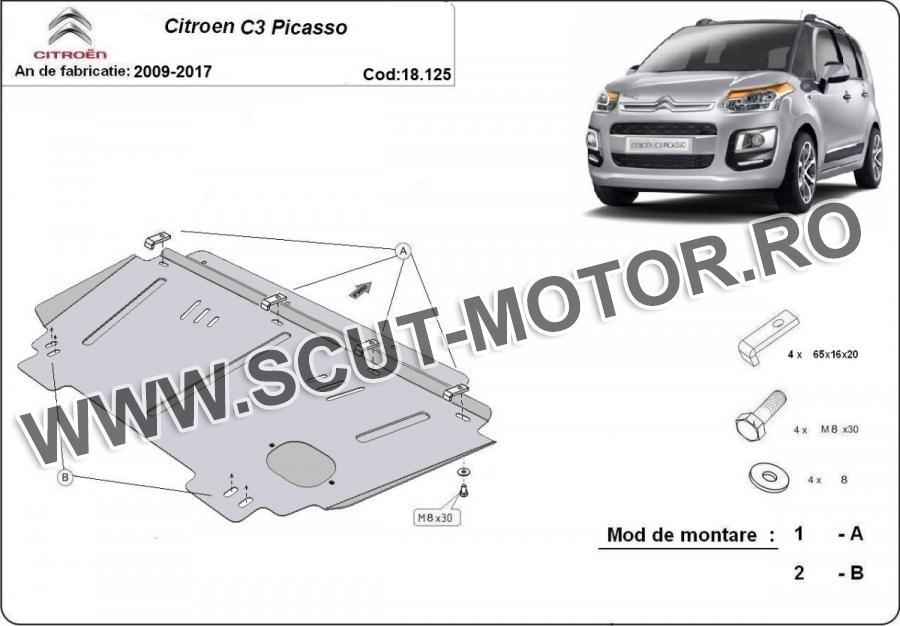 Scutul este noua si se potriveste perfect pentru toate tipurile de motorizare Citroen C3 Picasso fabricat între ani 2009 - 2017. Scutul protejeazã: motor, cutie de viteză.