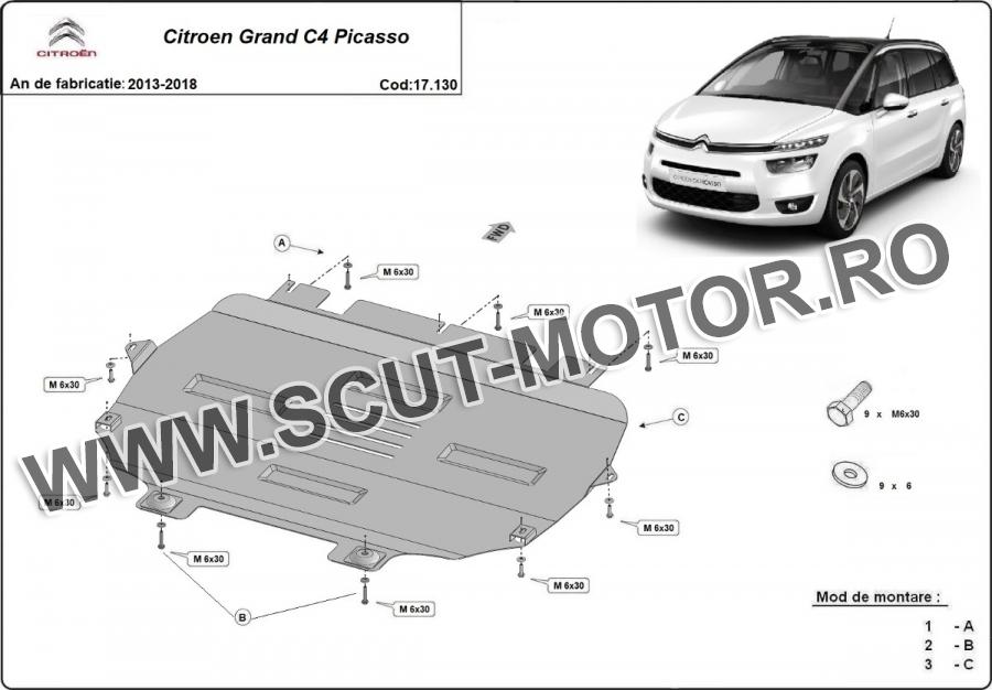Scutul este noua si se potriveste perfect pentru toate tipurile de motorizare Citroen Grand C4 Picasso fabricat între ani 2013 - 2018. Scutul protejeazã: motor, cutie de viteză, radiator.
