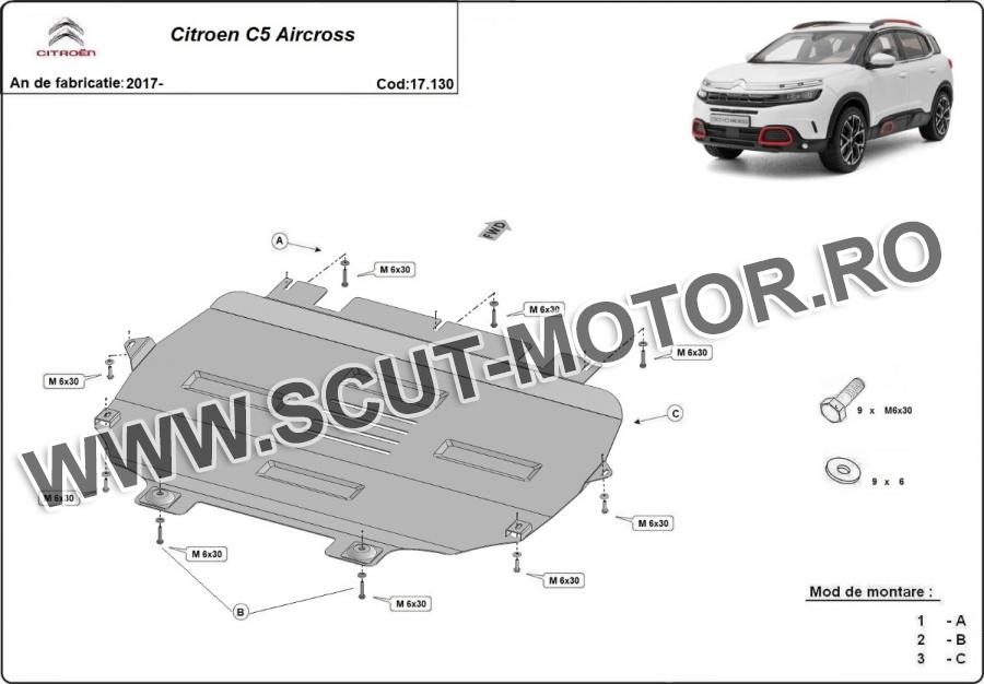 Scutul este noua si se potriveste perfect pentru toate tipurile de motorizare Citroen C5 Aircross fabricat între ani 2017 - 2026. Scutul protejeazã: motor, cutie de viteză, radiator.
