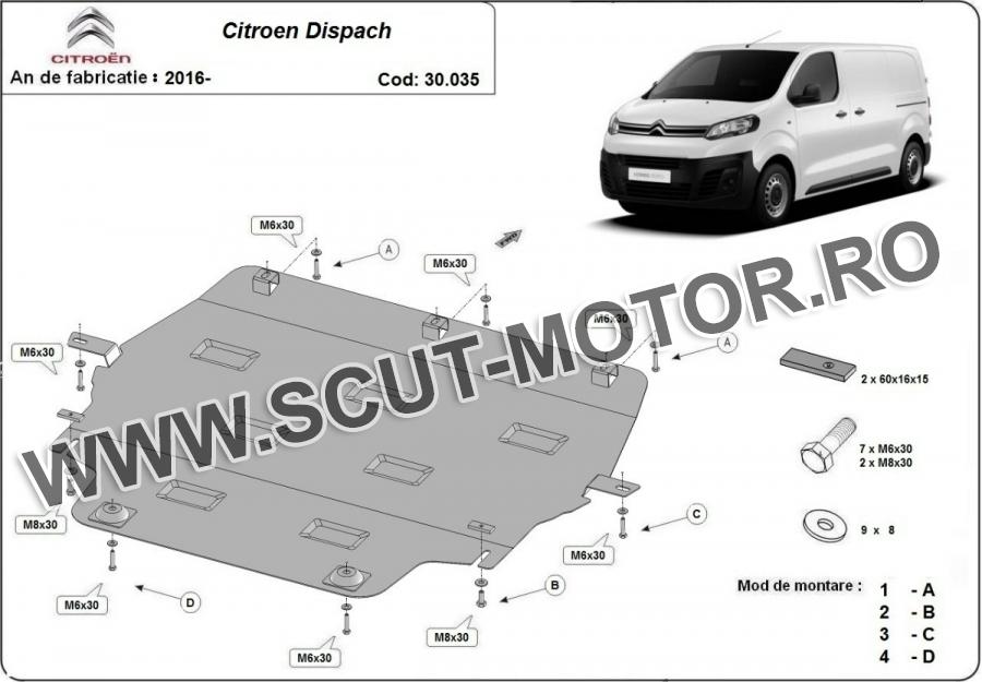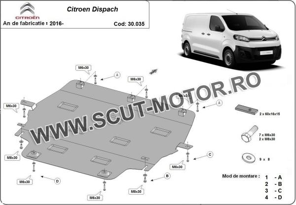 Scutul este noua si se potriveste perfect pentru toate tipurile de motorizare Citroen Dispatch fabricat între ani 2016 - 2025. Scutul protejeazã: motor, cutie de viteză, radiator.