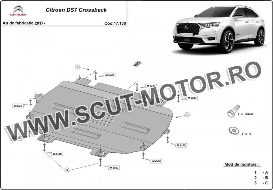 Scutul este noua si se potriveste perfect pentru toate tipurile de motorizare Citroen DS7 Crossback fabricat între ani 2017 - 2026. Scutul protejeazã: motor, cutie de viteză, radiator.