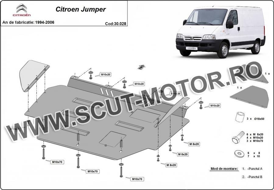 Scutul este noua si se potriveste perfect pentru toate tipurile de motorizare Citroen Jumper fabricat între ani 1995 - 2006. Scutul protejeazã: motor, cutie de viteză, radiator.