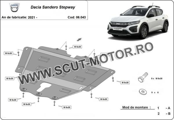 Scutul este noua si se potriveste perfect pentru toate tipurile de motorizare Dacia Sandero Stepway fabricat între ani 2021 - 2025. Scutul protejeazã: motor, cutie de viteză.