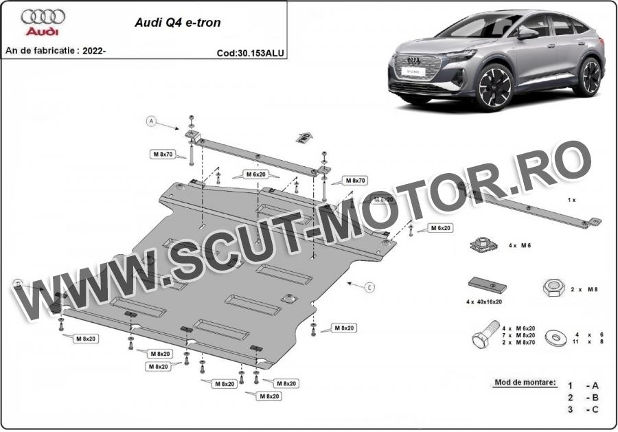 Scutul este noua si se potriveste perfect pentru toate tipurile de motorizare Audi Q 4 e-tron fabricat între ani 2022 - 2025. Scutul protejeazã: motor, cutie de viteză, radiator.