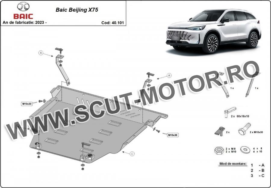 Scutul este noua si se potriveste perfect pentru toate tipurile de motorizare BAIC Beijing X75 fabricat între ani 2023 - 2025. Scutul protejeazã: motor, cutie de viteză, radiator.