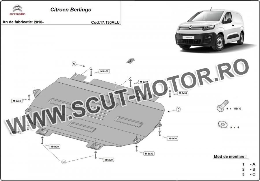 Scutul este noua si se potriveste perfect pentru toate tipurile de motorizare Citroen Berlingo fabricat între ani 2019 - 2026. Scutul protejeazã: motor, cutie de viteză, radiator, bara față.