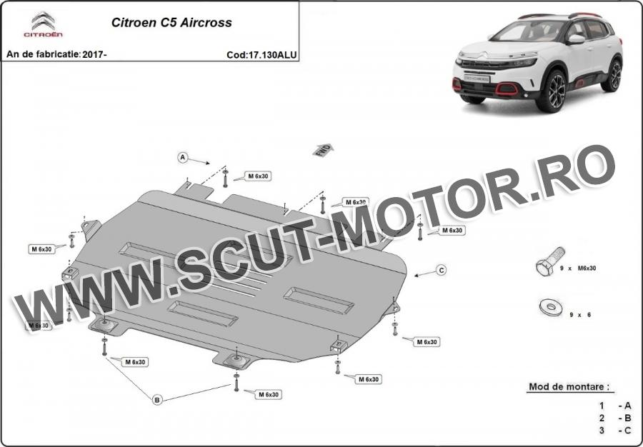Scutul este noua si se potriveste perfect pentru toate tipurile de motorizare Citroen C 5 Aircross fabricat între ani 2017 - 2026. Scutul protejeazã: motor, cutie de viteză, radiator, bara față.