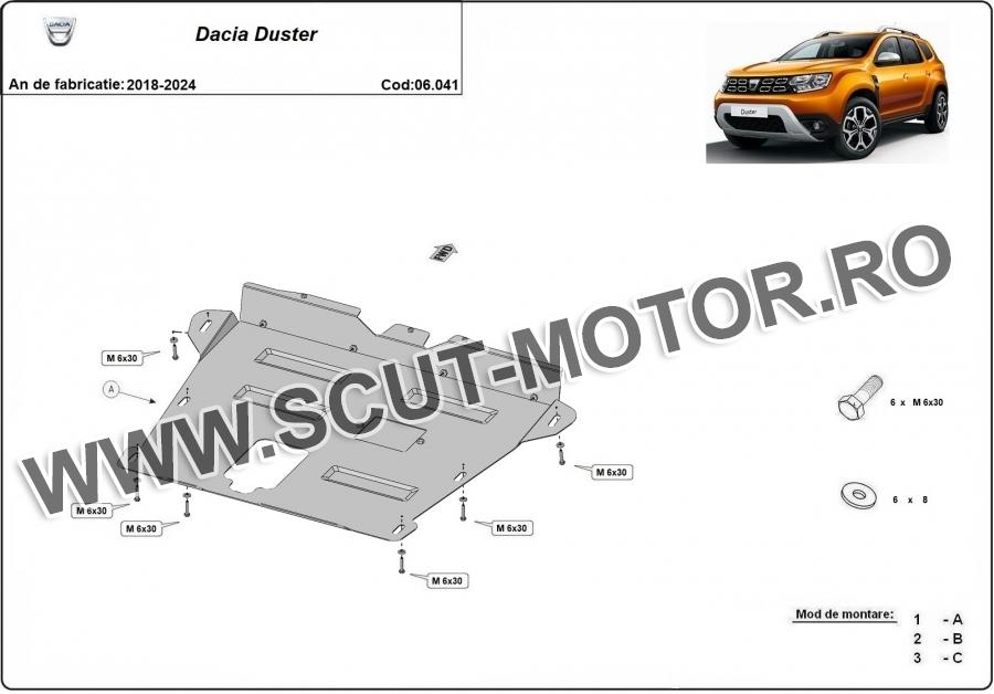 Scutul este noua si se potriveste perfect pentru toate tipurile de motorizare Dacia Duster fabricat între ani 2018 - 2024. Scutul protejeazã: motor, cutie de viteză.