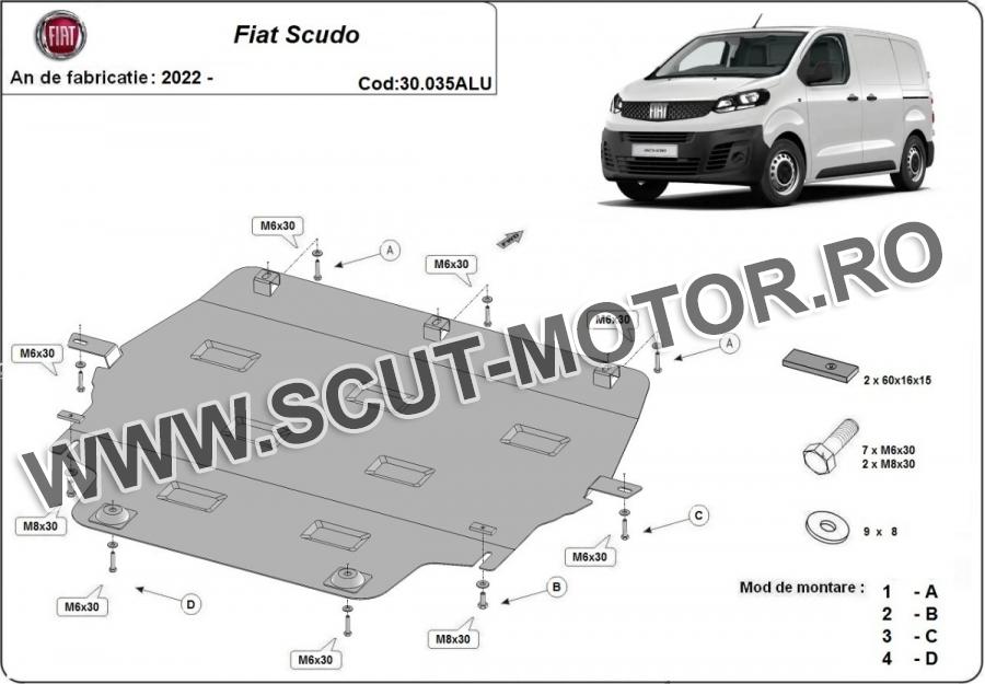 Scutul este noua si se potriveste perfect pentru toate tipurile de motorizare Fiat Scudo fabricat între ani 2022 - 2026. Scutul protejeazã: motor, cutie de viteză, radiator.