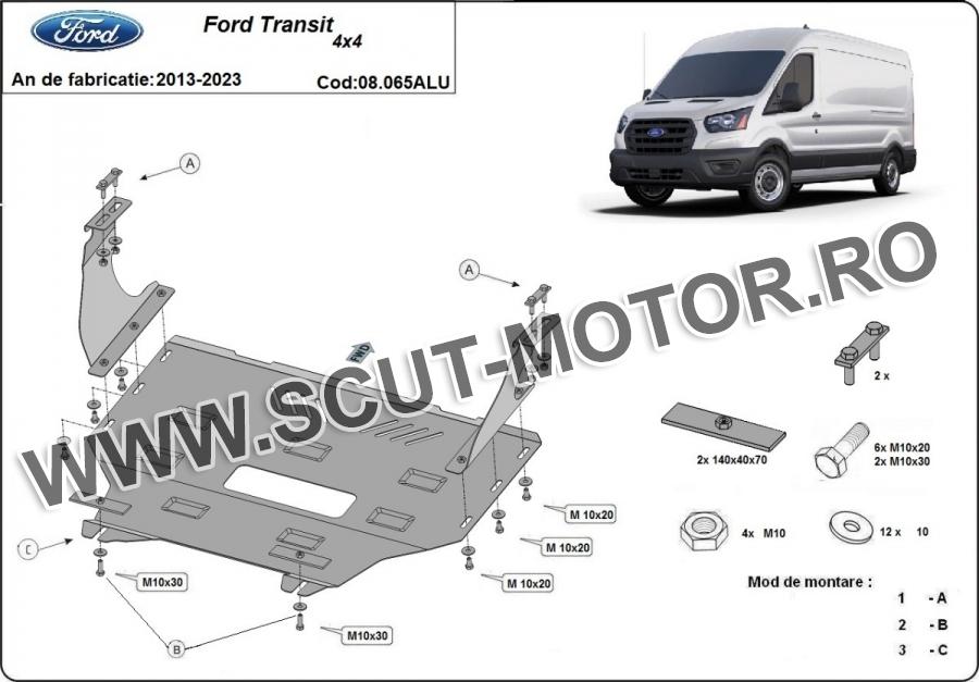 Scutul este noua si se potriveste perfect pentru toate tipurile de motorizare Ford Transit Connect 4x4 fabricat între ani 2013 - 2023. Scutul protejeazã: motor, cutie de viteză, radiator.