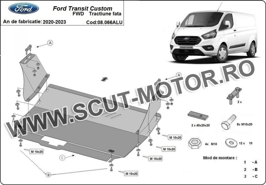 Scutul este noua si se potriveste perfect pentru toate tipurile de motorizare Ford Transit Custom fabricat între ani 2020 - 2023. Scutul protejeazã: motor, cutie de viteză, radiator, bara față.