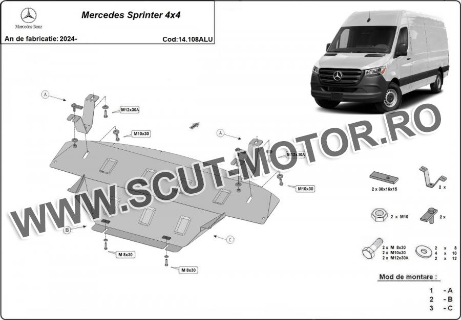 Scutul este noua si se potriveste perfect pentru toate tipurile de motorizare Mercedes Sprinter 4x4 fabricat între ani 2024 - 2025. Scutul protejeazã: motor, cutie de viteză, radiator, bara față.