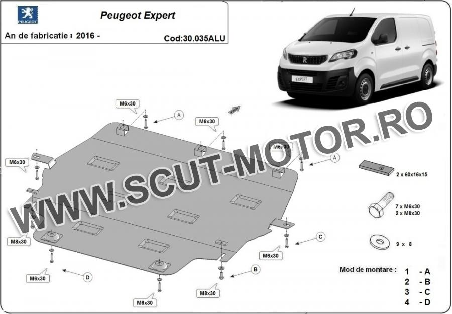 Scutul este noua si se potriveste perfect pentru toate tipurile de motorizare Peugeot Expert fabricat între ani 2016 - 2026. Scutul protejeazã: motor, cutie de viteză, radiator.
