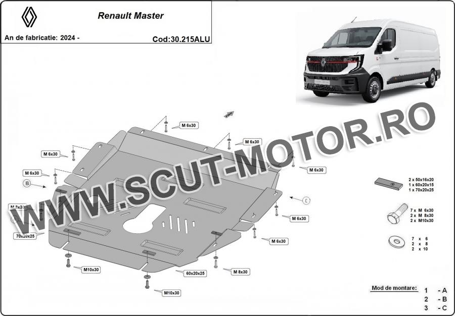 Scutul este noua si se potriveste perfect pentru toate tipurile de motorizare Renault Master fabricat între ani 2024 - 2026. Scutul protejeazã: motor, cutie de viteză, radiator.