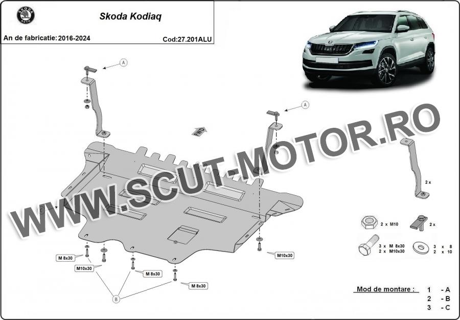 Scutul este noua si se potriveste perfect pentru toate tipurile de motorizare Skoda Kodiaq fabricat între ani 2016 - 2024. Scutul protejeazã: motor, cutie de viteză, radiator, bara față.