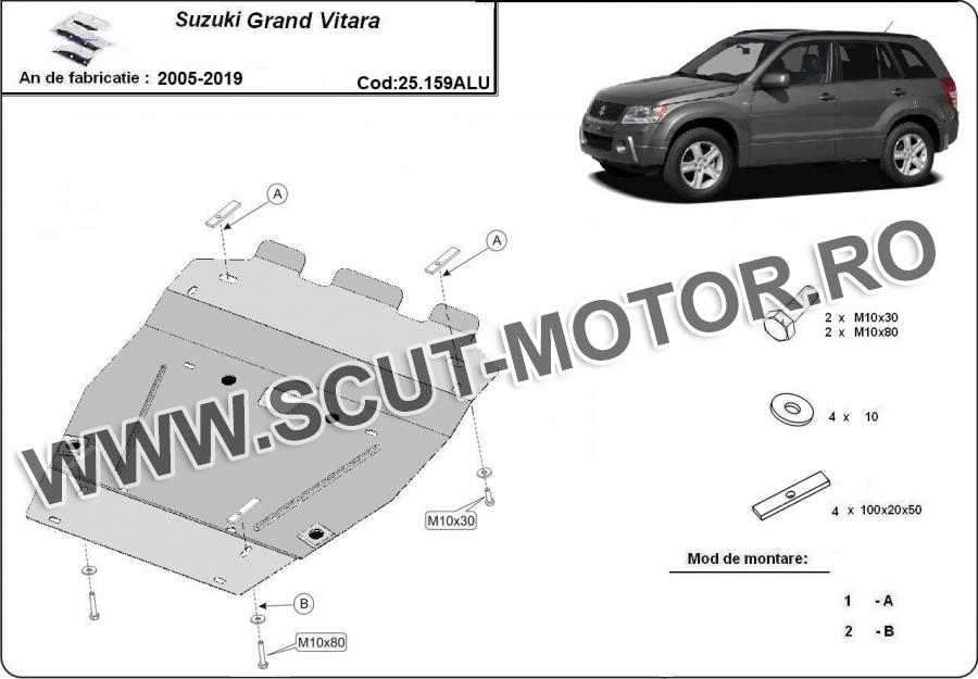 Scutul este noua si se potriveste perfect pentru toate tipurile de motorizare Suzuki Grand Vitara fabricat între ani 2005 - 2019. Scutul protejeazã: motor, radiator.