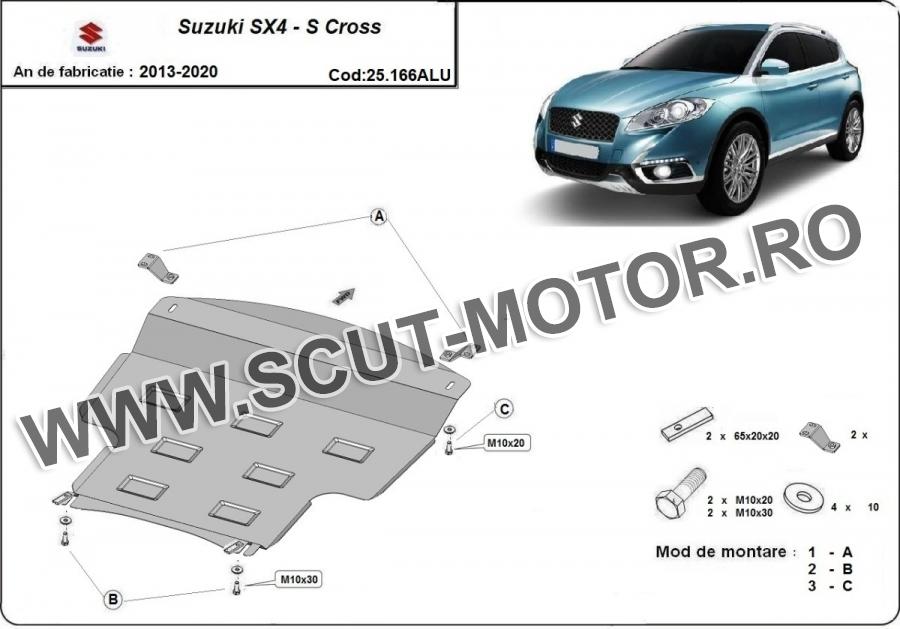 Scutul este noua si se potriveste perfect pentru toate tipurile de motorizare Suzuki SX4 S-Cross fabricat între ani 2013 - 2020. Scutul protejeazã: motor, cutie de viteză, radiator.