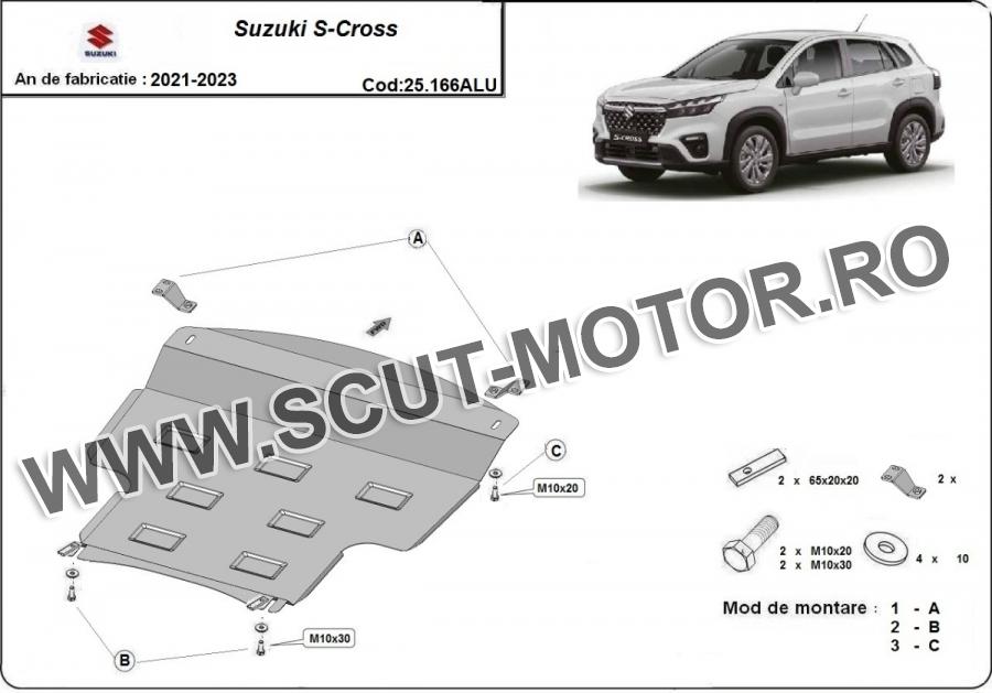 Scutul este noua si se potriveste perfect pentru toate tipurile de motorizare Suzuki SX4 S-Cross fabricat între ani 2021 - 2023. Scutul protejeazã: motor, cutie de viteză, radiator.