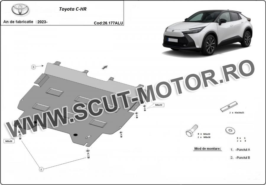 Scutul este noua si se potriveste perfect pentru toate tipurile de motorizare C-HR fabricat între ani 2023 - 2025. Scutul protejeazã: motor, cutie de viteză, radiator.