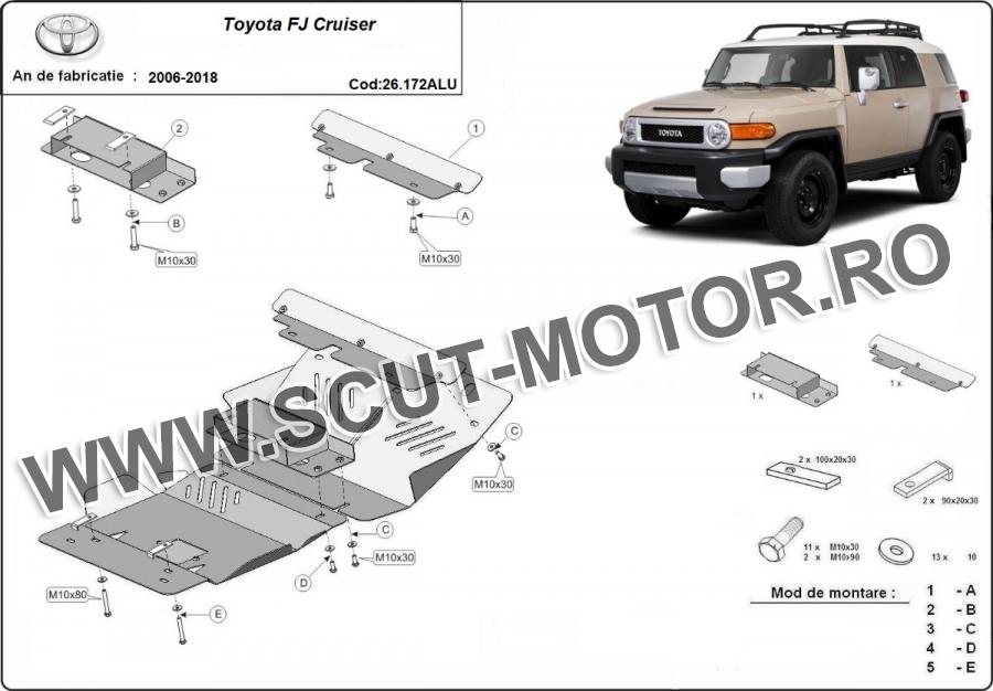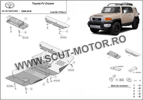 Scutul este noua si se potriveste perfect pentru toate tipurile de motorizare Toyota Fj Cruiser fabricat între ani 2006 - 2018. Scutul protejeazã: motor, radiator, bara față.
