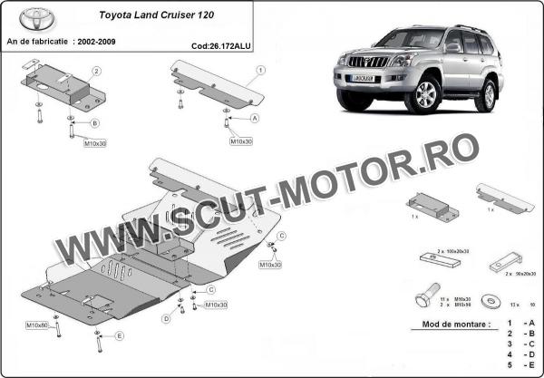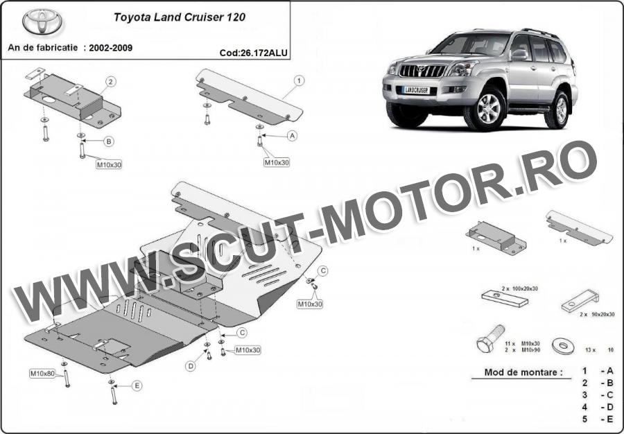 Scutul este noua si se potriveste perfect pentru tipurile de motorizare 3.0,4.2 D - Toyota Land Cruiser J120 fabricat între ani 2002 - 2009. Scutul protejeazã: motor, radiator, bara față.