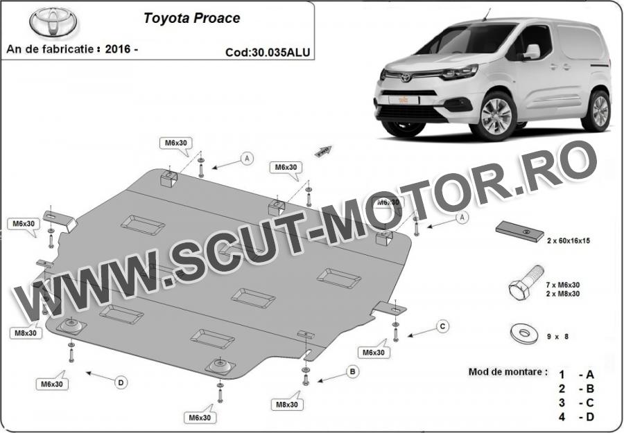 Scutul este noua si se potriveste perfect pentru toate tipurile de motorizare Toyota Proace fabricat între ani 2016 - 2026.