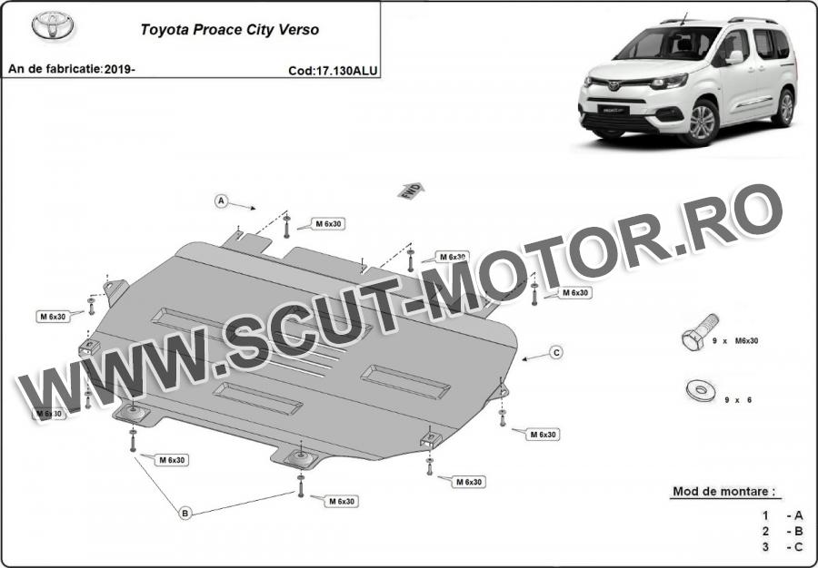Scutul este noua si se potriveste perfect pentru toate tipurile de motorizare Toyota Proace City Verso fabricat între ani 2019 - 2026. Scutul protejeazã: motor, cutie de viteză, radiator, bara față.