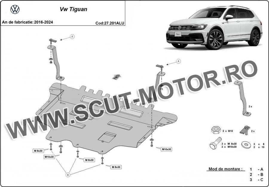 Scutul este noua si se potriveste perfect pentru toate tipurile de motorizare Volkswagen Tiguan fabricat între ani 2016 - 2024. Scutul protejeazã: motor, cutie de viteză, radiator, bara față.