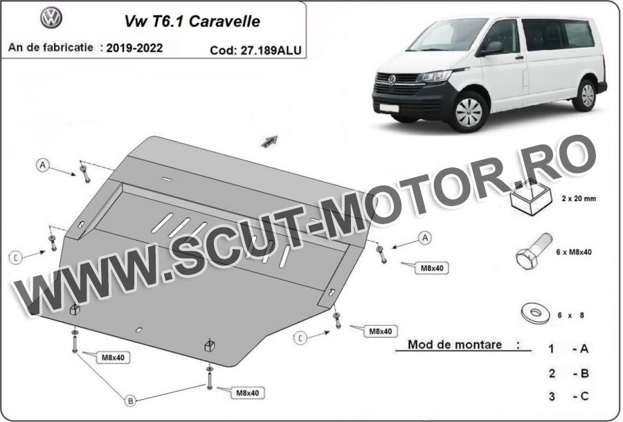 Scutul este noua si se potriveste perfect pentru toate tipurile de motorizare Volkswagen Transporter T6.1 Caravelle fabricat între ani 2019 - 2022. Scutul protejeazã: motor, cutie de viteză, radiator, bara față.