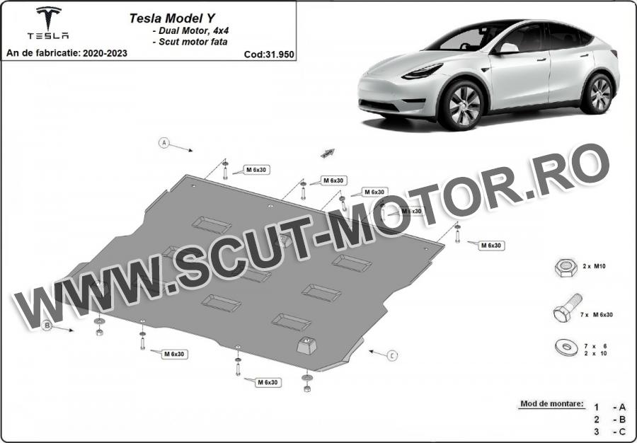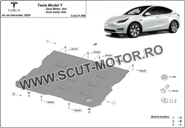 Scutul este noua si se potriveste perfect pentru tipurile de motorizare Dual Motor - Tesla Model Y AWD fabricat între ani 2020 - 2023. Scutul protejeazã: motor electric faţă .