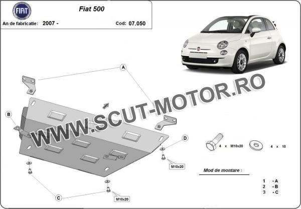 Scutul este noua si se potriveste perfect pentru toate tipurile de motorizare Fiat 500 fabricat între ani 2007 - 2025. Scutul protejeazã: motor, cutie de viteză, radiator.