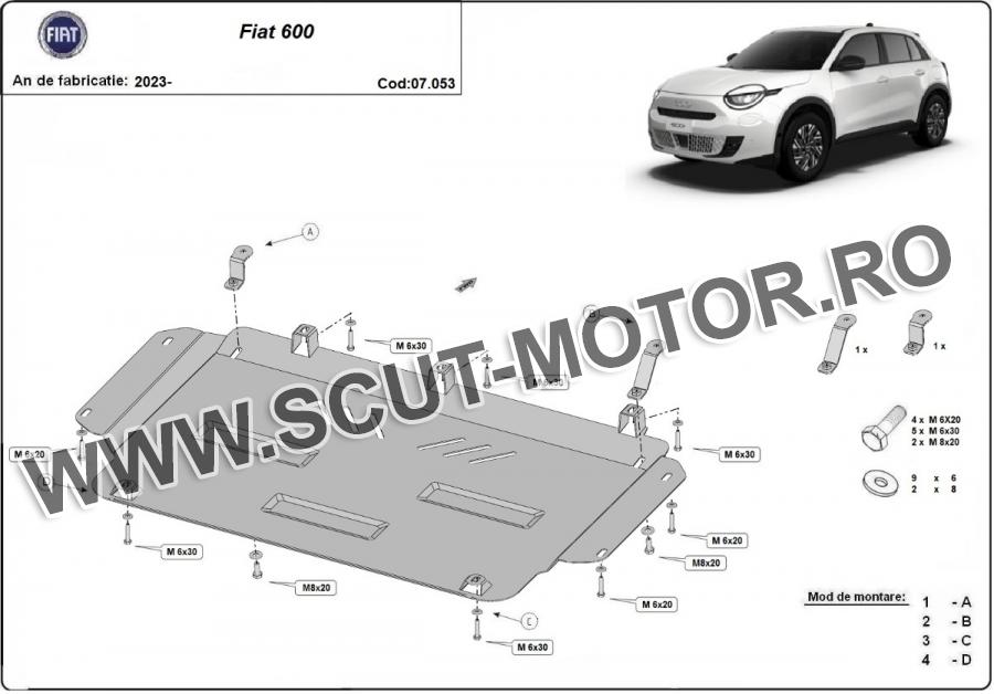 Scutul este noua si se potriveste perfect pentru toate tipurile de motorizare Fiat 600 fabricat între ani 2023 - 2025. Scutul protejeazã: motor, cutie de viteză, radiator.