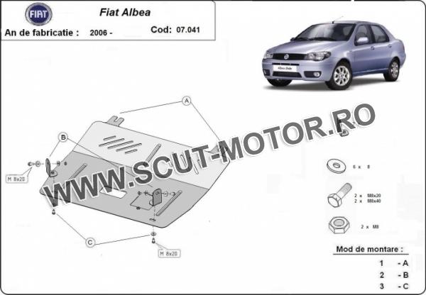 Scutul este noua si se potriveste perfect pentru toate tipurile de motorizare Fiat Albea fabricat între ani 2002 - 2012. Scutul protejeazã: motor, cutie de viteză.